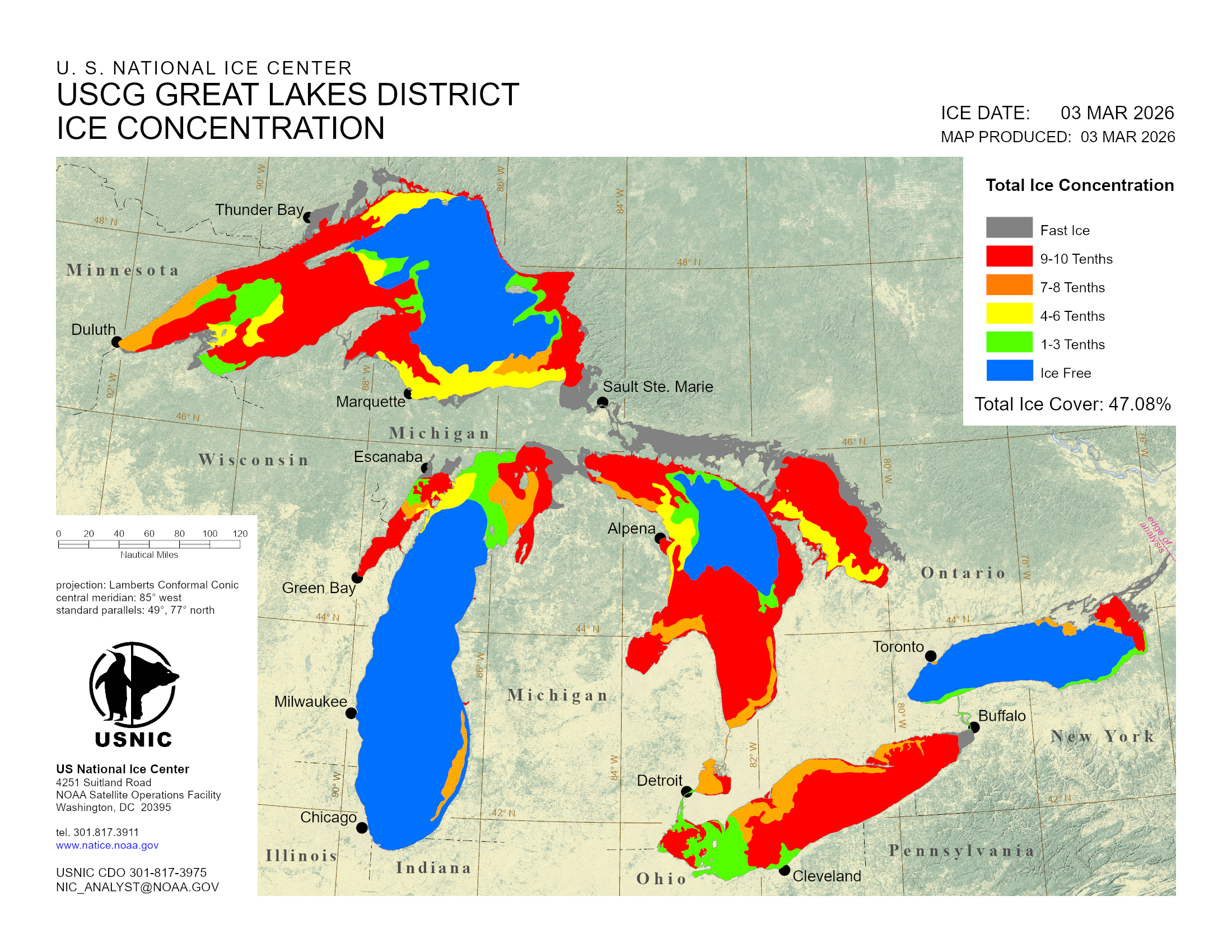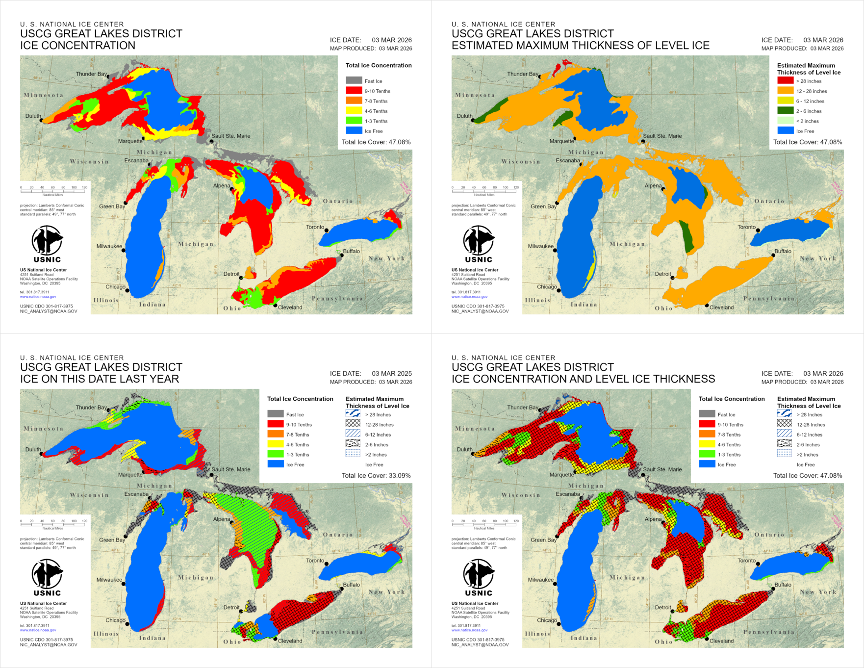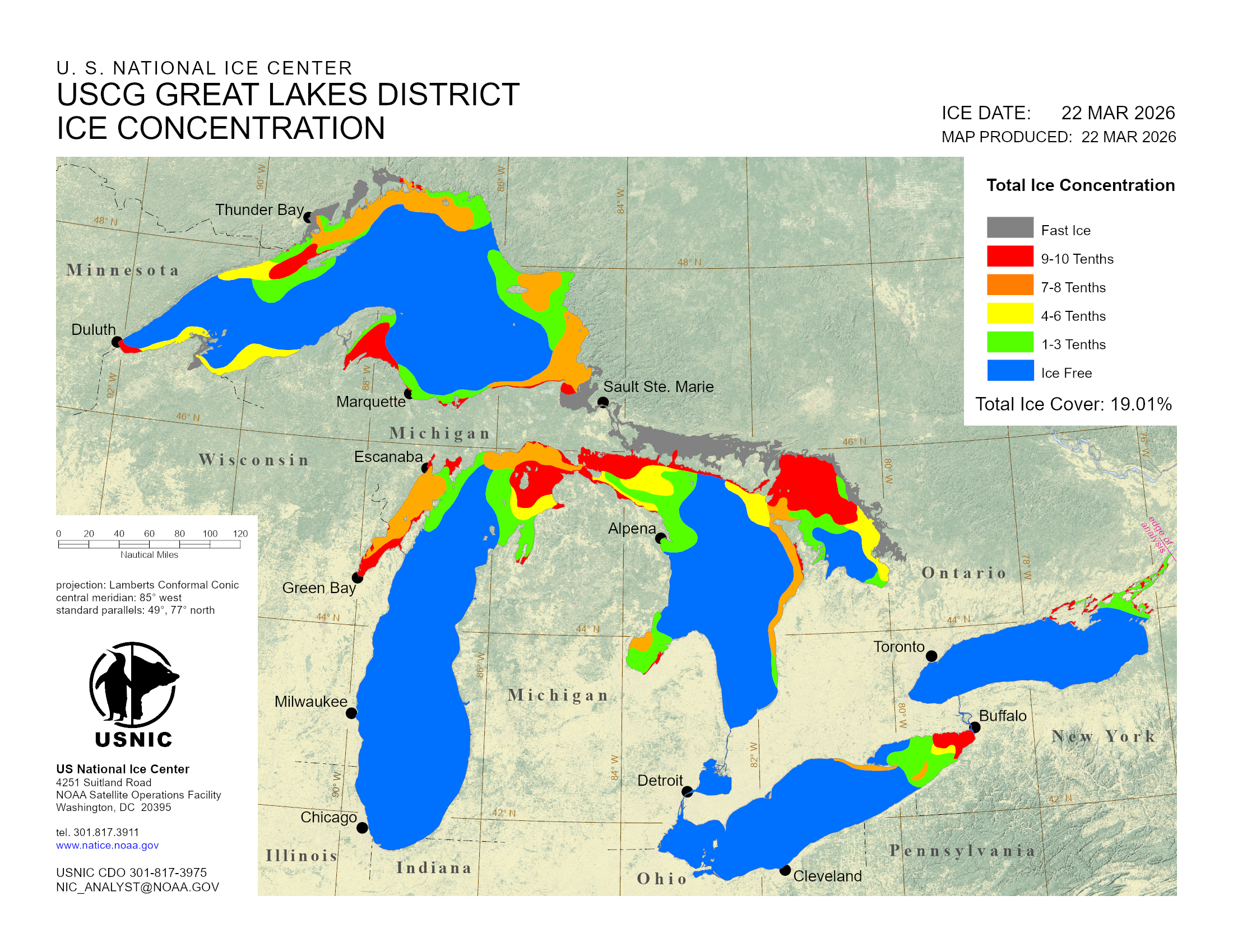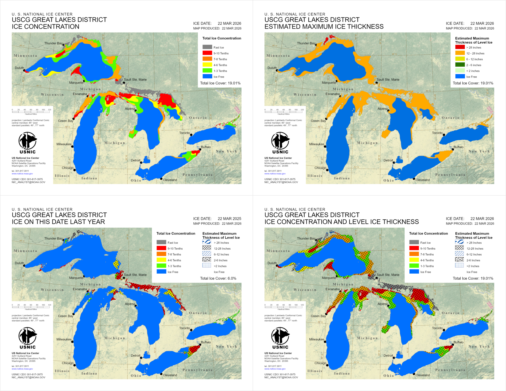 Great Lakes ice charts are produced off the daily Great Lakes ice analysis in cooperation with the U.S. National Ice Center (USNIC) and Canadian Ice Center. The charts are separated into eastern and western portion of the Great Lakes and available in color and black/white. USNIC also produces periodic ice charts for U.S. Coast Guard District 9 support broken into ice concentration, ice thickness/type, and a combination of both.