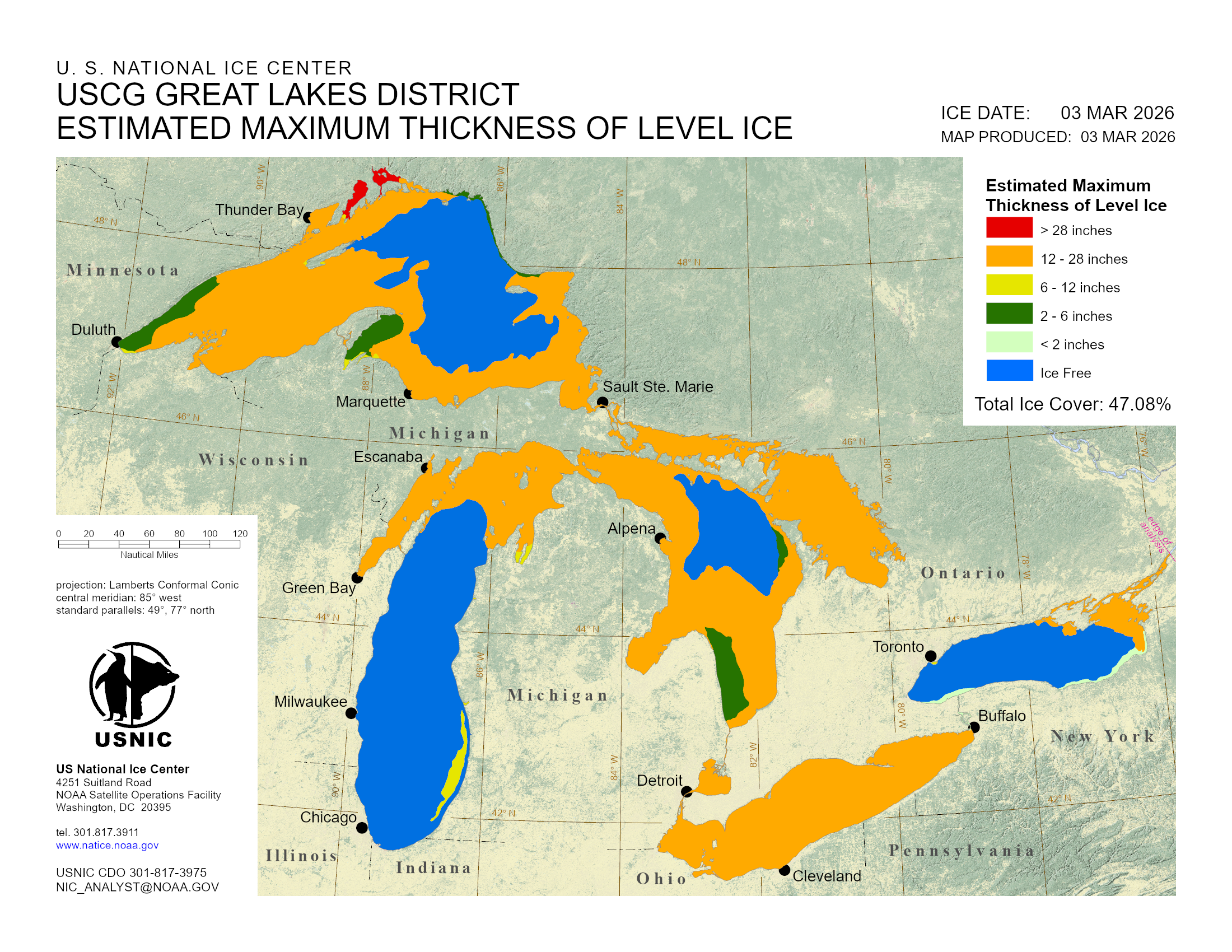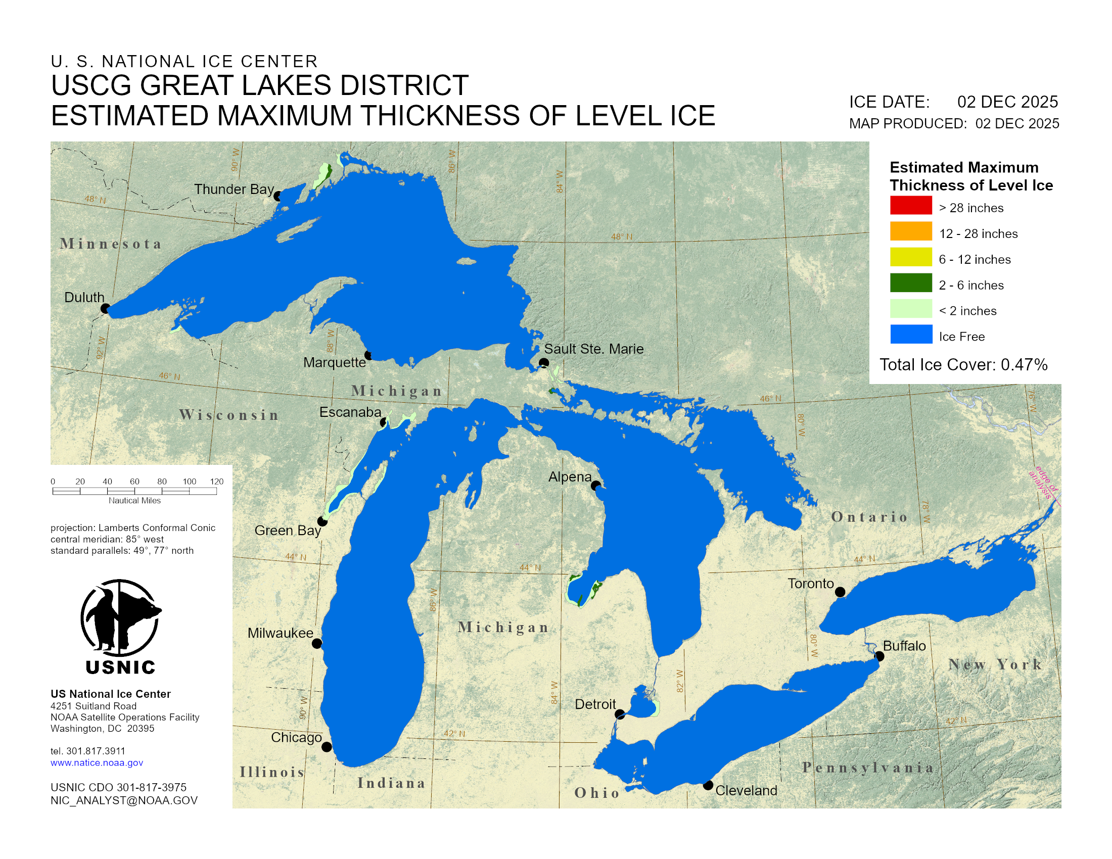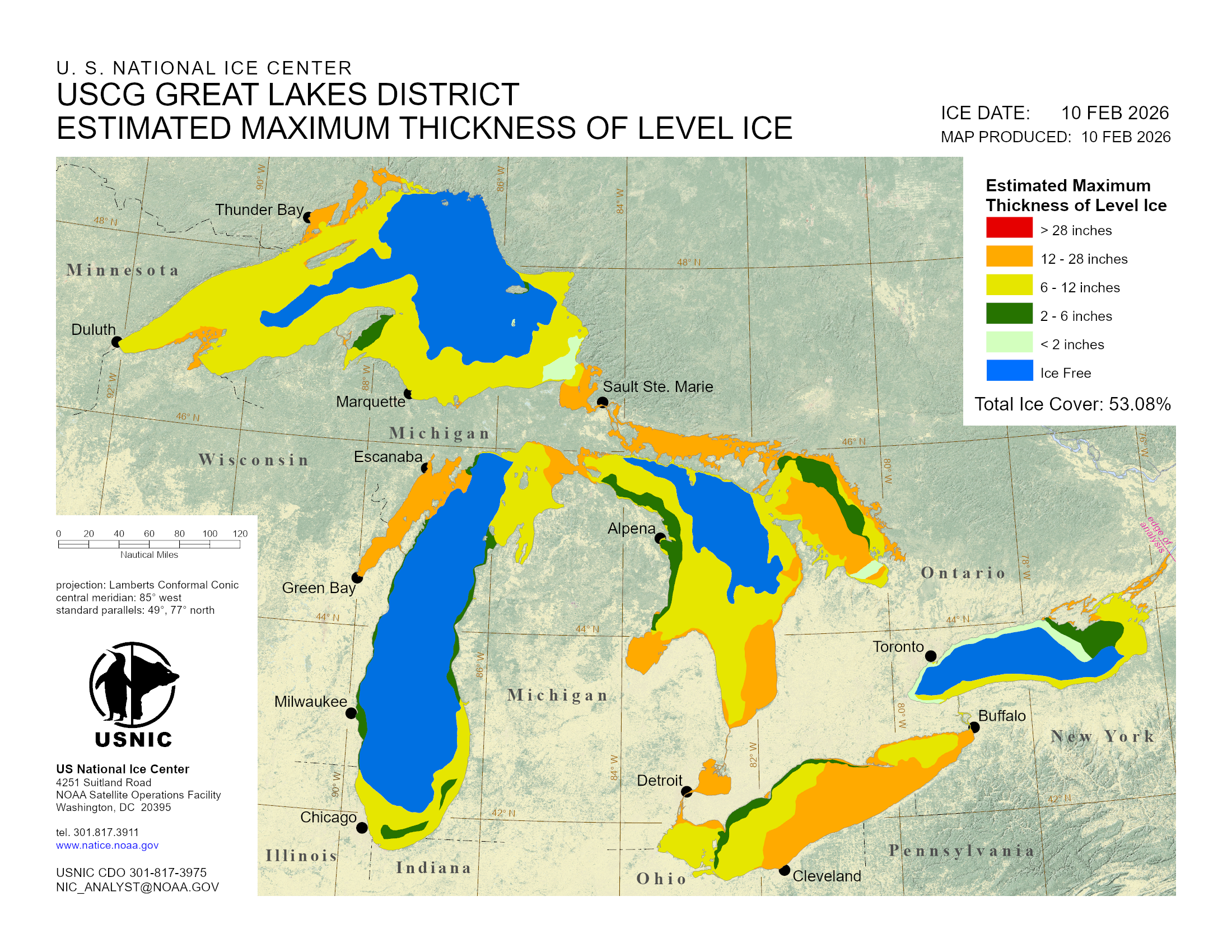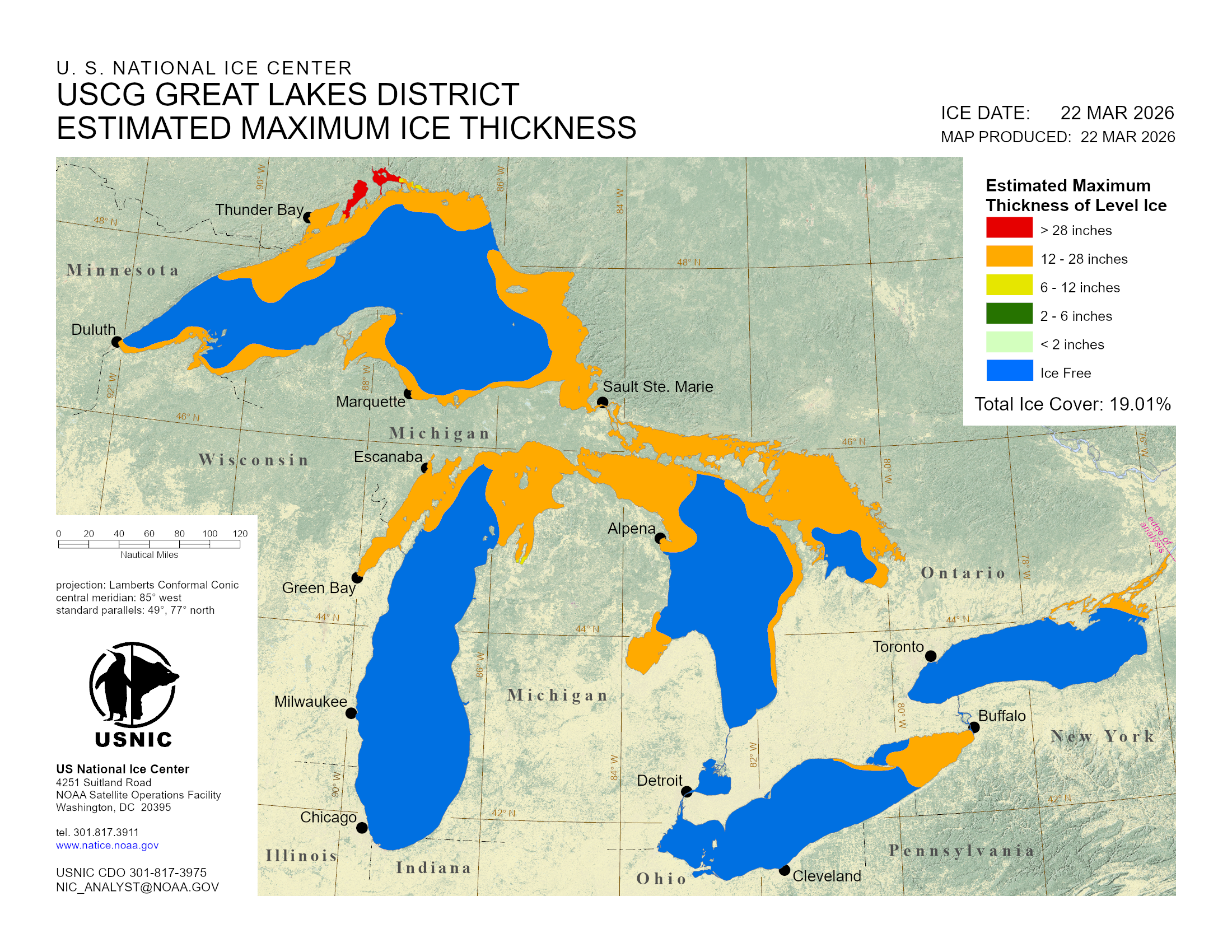 Great Lakes ice charts are produced off the daily Great Lakes ice analysis in cooperation with the U.S. National Ice Center (USNIC) and Canadian Ice Center. The charts are separated into eastern and western portion of the Great Lakes and available in color and black/white. USNIC also produces periodic ice charts for U.S. Coast Guard District 9 support broken into ice concentration, ice thickness/type, and a combination of both.