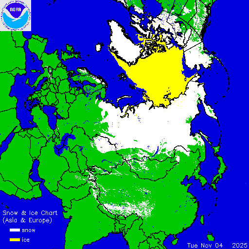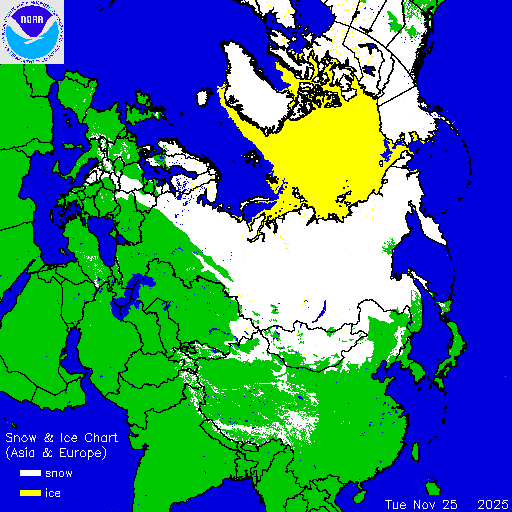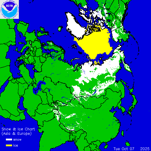 Daily chart that represents the current snow and ice conditions that concentrates on Asia, Europe, and Arctic regions.