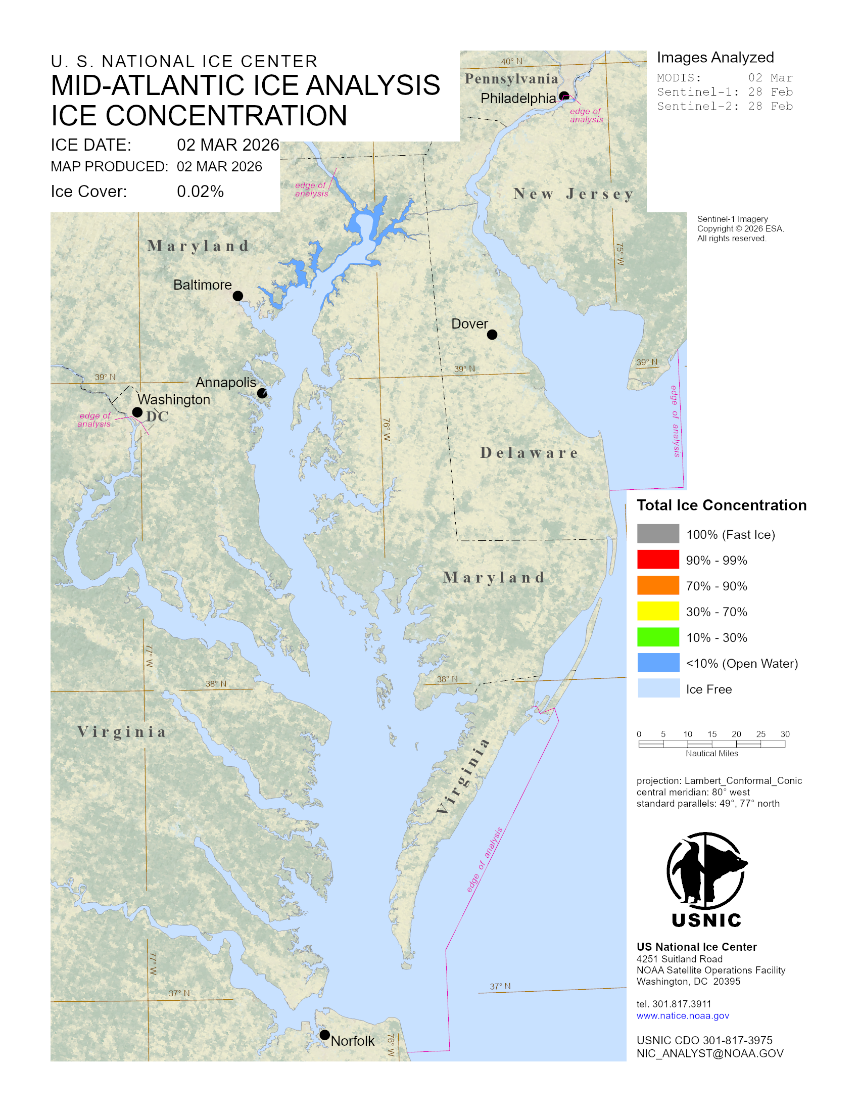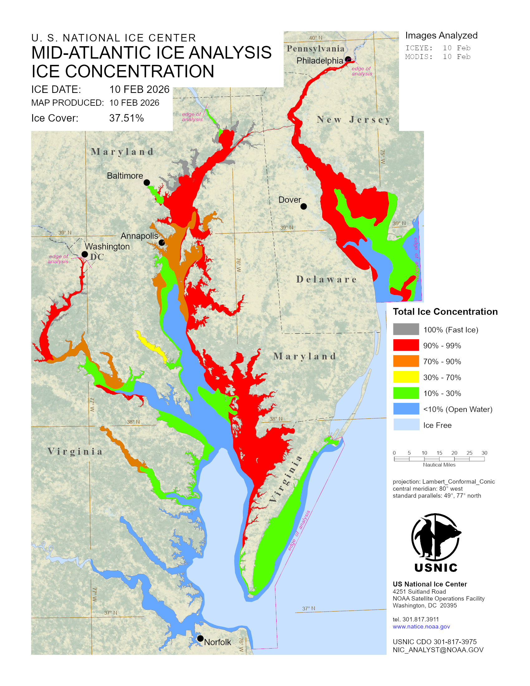 When ice is present within the Mid-Atlantic region of the U.S., the U.S. National Ice Center conducts an ice analysis of the area and produce an ice chart detailing ice conditions. Also with ice presence, a weekly outlook is produced that details the upcoming weather conditions and its affect on ice conditions.