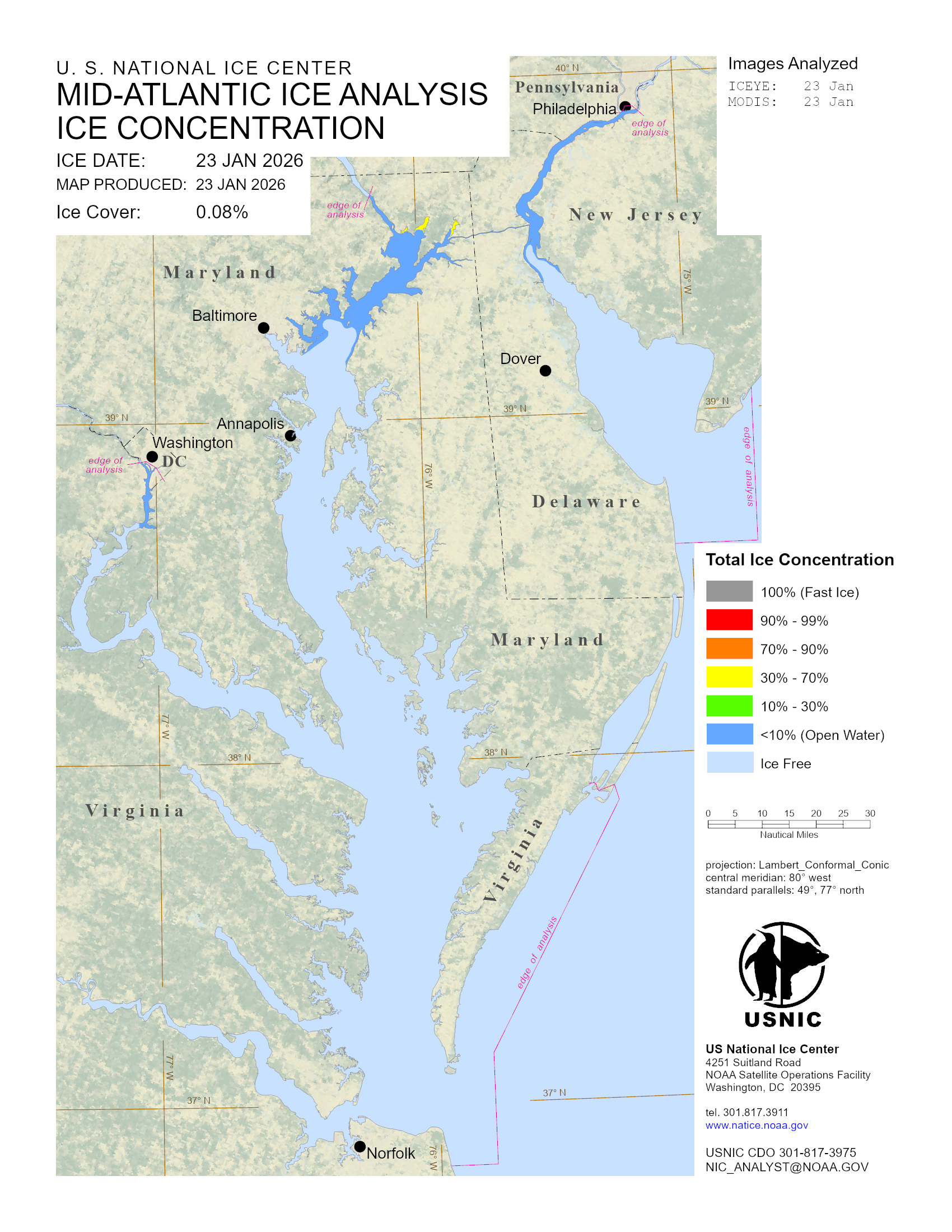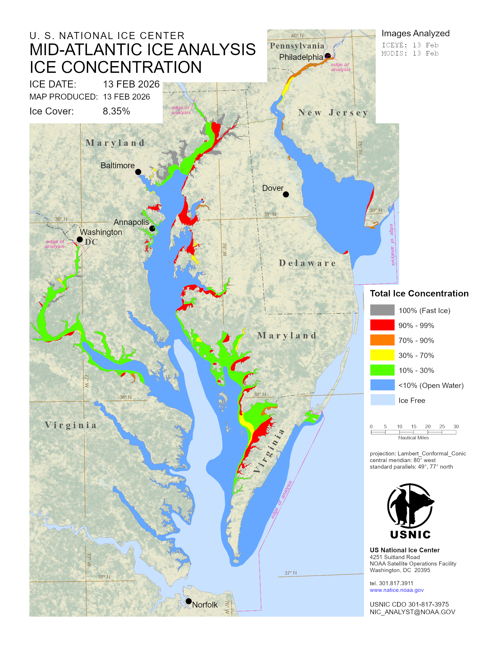 The U.S. National Ice Center (USNIC) monitors and records ice conditions within the Mid-Atlantic coastal region. A main area of recurring seasonal ice (may have years of no ice) is the Chesapeake, Potomac and Delaware Bay region. When ice is present, USNIC produces an ice chart, weekly outlook and associated support files.